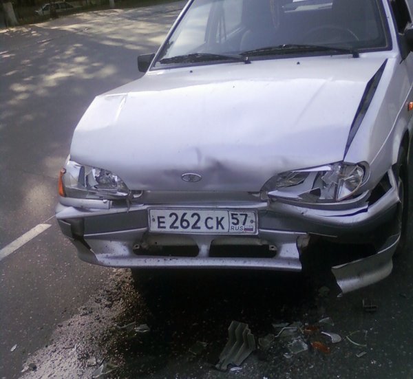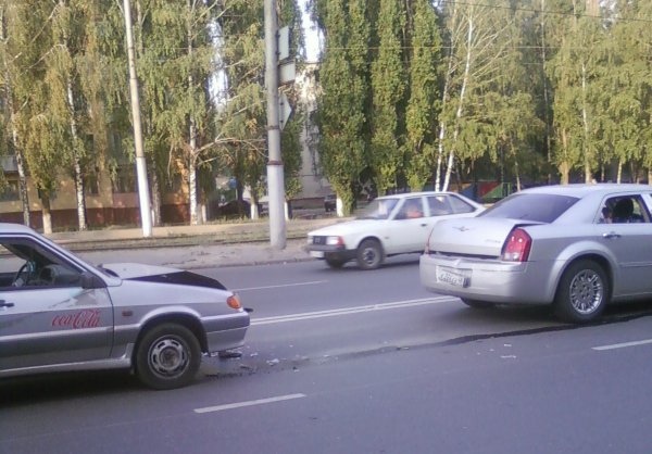 Вообще все получилось как бы не по вине 14. Проехав зеленый светофор на нормальной скорости вдруг увидел, что красная девятка почему-то круто затормозила перед бабкой, стоявшей на разделительной полосе, переходя дорогу в неположенном месте (причем полосу девятки она уже перешла и ждала проезда встречных машин). Сначала не врубился, а когда резко затормозил и остановился в 2-х см от заднего бампера девятки, увидел, что за рулем сидит девушка и сразу все понял, но не до конца, потомучто в следующую секунду Крайслер качнулся и я услышал громкий звук удара. Вот, собственно, все ощущения. Красная девятка, конечно, сквозонула, а бабка тоже сочла за благо быстренько свалить (да и не вижу особо ее вины) Собралась толпа и все ох...али от наших слишком уж контрастных повреждений. Сказали, что Крайслер встал как вкопаный (не больше 50 см тормозной путь) а вот 14 протащило метров пять...