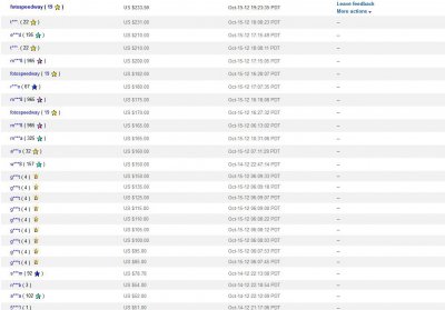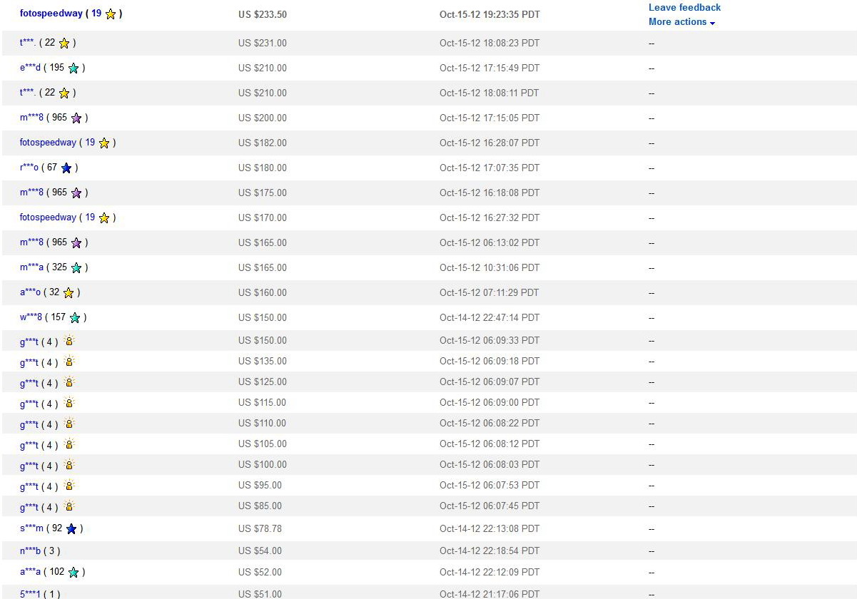 Цитата: Prime-avto Имя D.....E И рядом значок 19 отзывов Желатая звезда Инициалы покупателей меняются для посторонних. У меня ник F.......Y Шифрует их еБэй зачем-то.  Отзывов у меня 28, +5 еще на подходе. Кстати если купил у одного продавца несколько товаров сразу Все равно поставят только один отзыв Даже если и не сразу, а в разные дни, звезда будет только одна от одного продавца. Ладно, наберу еще. Долго пользовался услугами посредника, так бы уже к сотне подогнал  |