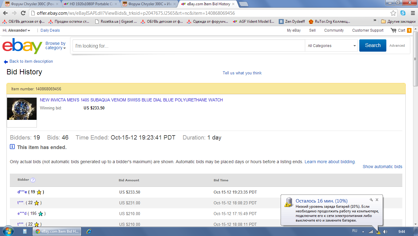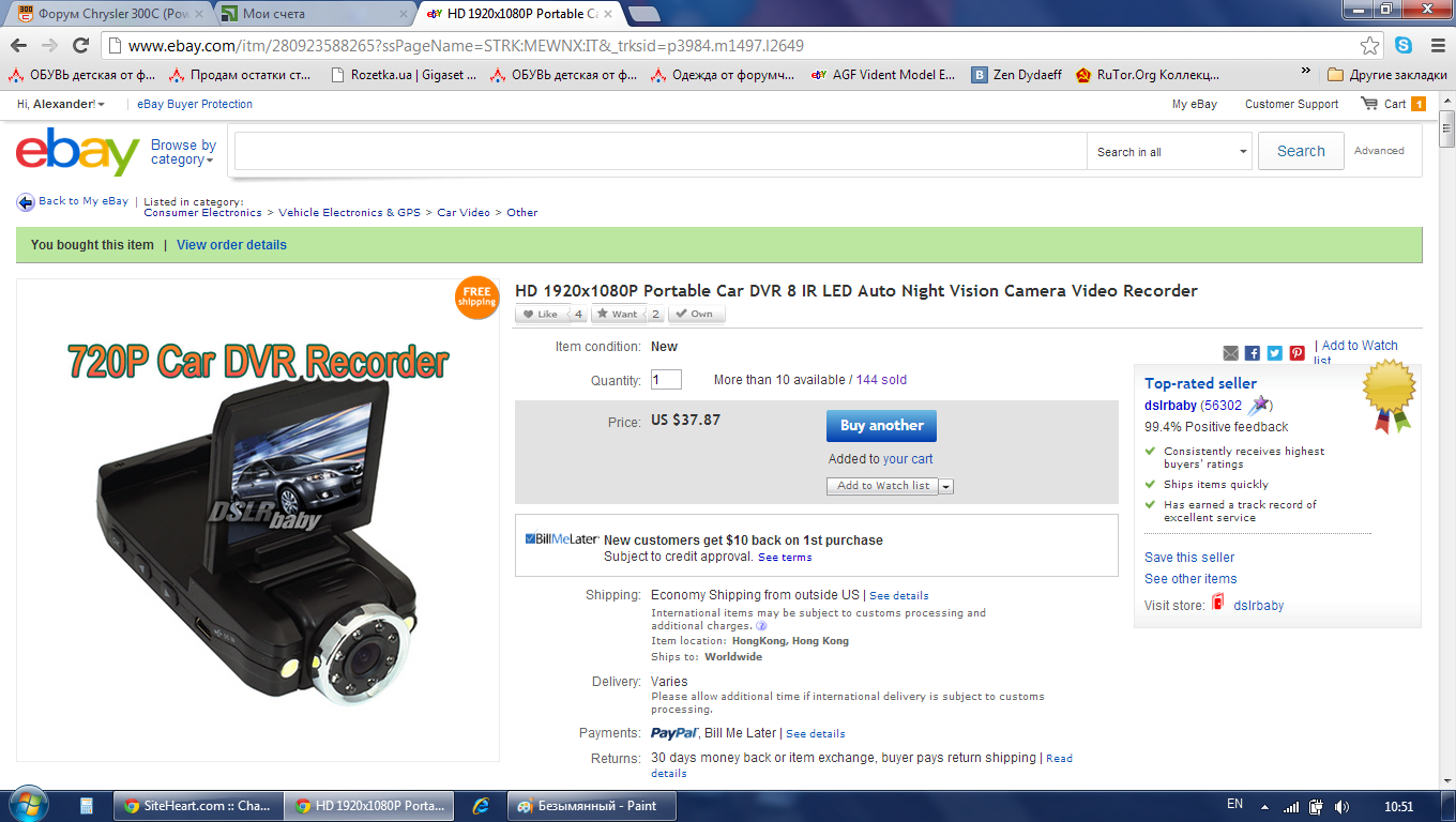 John333Это я знаю Так часы выграл покупатель именем на букву D Глянь сам ты сылку давал Нечего не понимаю тогда Если разные товары то звезд будет столько столько покупок У меня уже 70 помоему звезд А покупок больше наверное около 90 И деньги уже 3 раза возращал с помощью Пай пел Последний раз как помнишь повелся на шару и купил якобы телефон Но все вернули Вот сейчас перевел на карту доллары покупаю уже второй регистратор Довольно неплохо все снимает И цена шара 37 баксов с доставкой Если надо сылка http://cgi.ebay.com/ws/eBayISAPI.dll?ViewItem&item=280923588265 |
